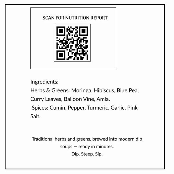Herbs & Greens – Moringa, Hibiscus, Blue Pea, Curry Leaves, Balloon Vine, Amla Spices – Cumin, Pepper, Turmeric, Garlic, Pink Salt