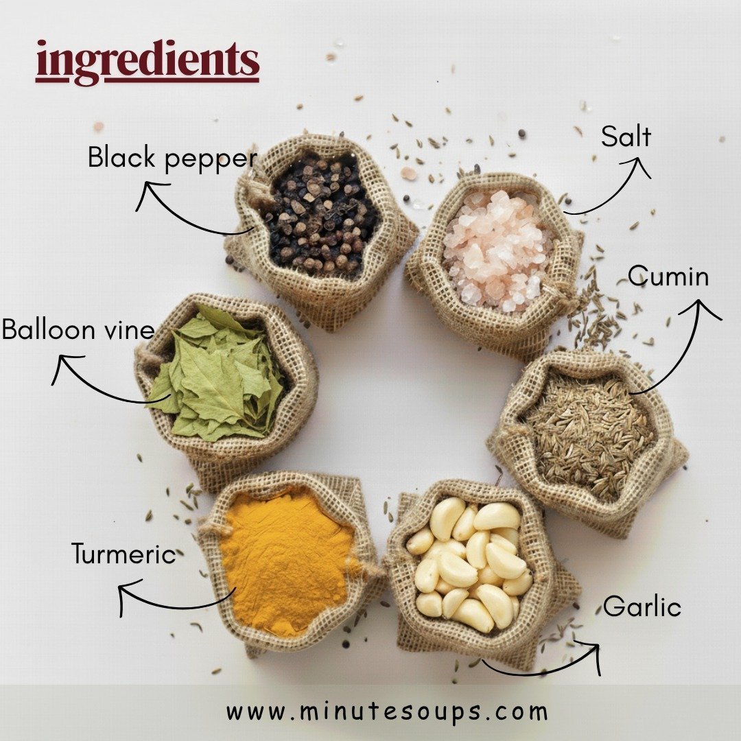 Balloon Vine, Cumin, Black Pepper, Garlic, Turmeric, Rock Salt.