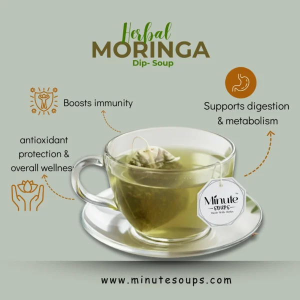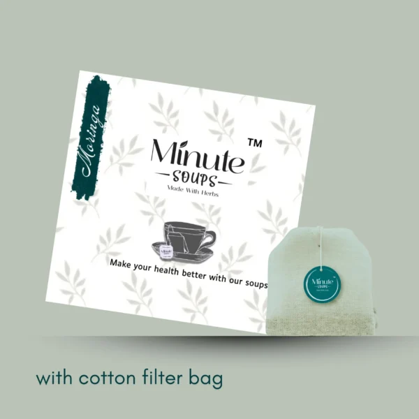 Enjoy a light, savoury moringa soup in 3–4 minutes. Plant-based, clean label, cotton-filter pouches. No preservatives or added colours/flavours.