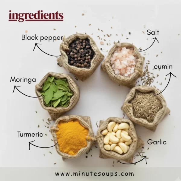 Moringa Leaves, Cumin, Black Pepper, Garlic, Turmeric, Rock Salt.